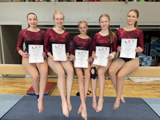 Als dritte Kür-Mannschaft starteten in der Liga 3: Josefine Stelter (Platz 12), Lotta Greve (Platz 13), Nora Weist (Platz 14), Mila Gottschalk (Platz 15), Scarlett Dell (Platz 16) und Lucy Klein (Platz 18). Die meisten der Turnerinnen turnten erstmals in der Kürklasse. In der LK4 darf man die Übungen mit allen turnerischen Elementen zusammenstellen, um die Anforderungen zu erfüllen, allerdings ist dies auch in der dieser Liga besonders am Stufenbarren und Balken schon recht schwierig. Ein akrobatisches Element auf dem 10 cm breiten Schwebebalken zu turnen ist schon eine große Herausforderung. Auch der Sprung auf oder über den 1,10 m hohen Sprungtisch ist nicht einfach. Am Boden konnte sich die Mannschaft am besten präsentieren und belegte am Ende den 3. Platz vor dem TuS Kalefeld. Bis zur Rückrunde im November wird jetzt fleißig weiter trainiert um noch fehlende Elemente zu erlernen und andere zu festigen. Betreut und trainiert werden die Mannschaften von Antje Schmidt, Carina Pygoch, Katrin Schoppe und Sandra Neumann. Als Kampfrichterinnen waren sowohl Trainer wie auch einige der älteren Turnerinnen im Einsatz.