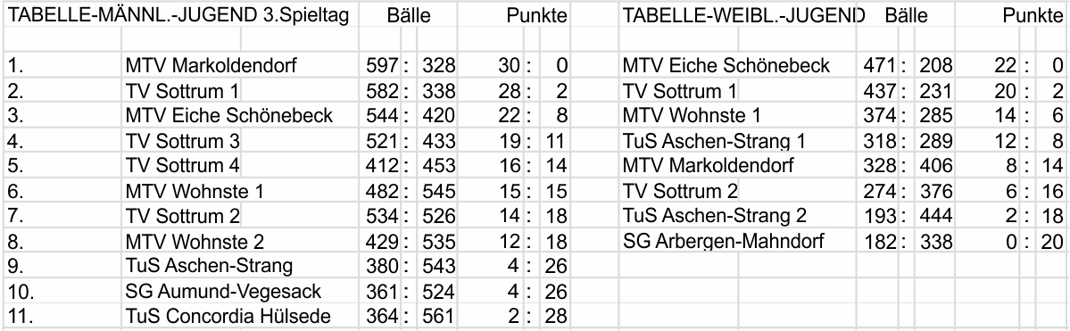 Leider gab es hohe Niederlagen gegen TV Sottrum (18:46), TuS Aschen-Strang (20:49), und TuS Concordia Hülsede (25:46). Grund dafür ist, dass die MTV-Jungen das mit Abstand jüngste Team, und damit auch körperlich unterlegen war. Dennoch waren eingeübte Spielzüge zu erkennen und es gelangen auch einige Abwehr- und Angriffsaktionen. So belegten sie den vierten Platz und strahlten bei der Siegerehrung, als sie erfuhren, dass sie als Nachrücker zur Norddeutschen Jugendmeisterschaft eingeladen sind.