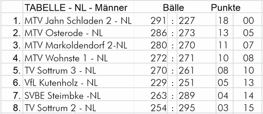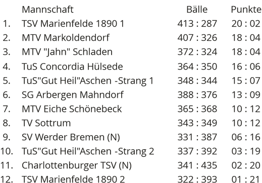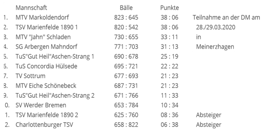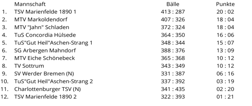Die Tabellenspitze: 1. MTV Markoldendorf 28:4 Punkte, 2. MTV "Jahn" Schladen 26:8, 3. SG Arbergen Mahndorf 25:7, 4. TSV Marienfelde 1890 1 23:11 und 5. TuS Concordia Hülsede 22:10 Punkte.