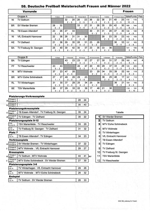 Für das Turnier in der Dasseler Turnhalle am 21./22. Mai hatten sich jeweils 12 Herren- und 12 Damenmannschaften qualifiziert. Schon in den Gruppenspielen am Samstag gab es spannende Begegnungen und am Sonntag wurden dann in den Plazierungs- und Endrunden die Deutschen Meister ermittelt, die Ergebnisse siehe unten.