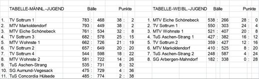 Die männl. Jugend mit Simon Leder, David Kemenji, Justus Hake und Julian Severit kam als Tabellenzweiter zum letzten Spieltag. Nach vier gewonnenen Spielen verloren sie die letzte Begegnung gegen den TV Sottrum und erreichten bei diesem Spieltag 8:2 Punkte. Doch die Spitze lag so dicht zusammen, dass die Markoldendorfer auf den 4. Platz abrutschten.